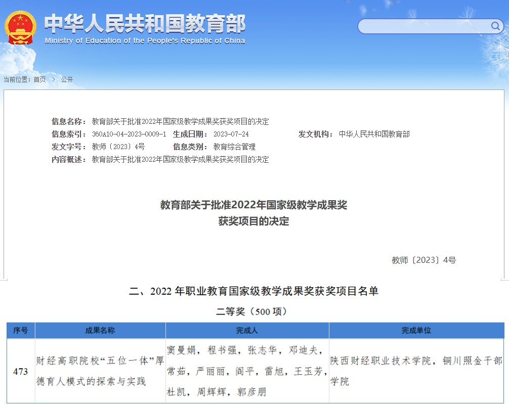 7月24日,教育部正式公布了2022年国家级教学成果奖获奖项目名单。我校《财经高职院校“五位一体”厚德育人模式的探索与实践》喜获国家级教学成果奖二等奖,实现了我校在国家级教学成果奖上的历史性突破。